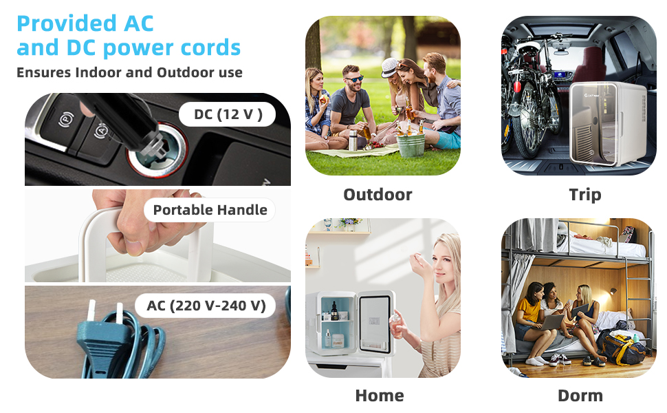 Compact & Portable Mini Fridge: The mini refrigerator comes with AC and DC power adapters, which fully meet your needs in various scenarios such as home, office, travel, dormitory and more. With a built-in portable handle, the movement is effortless. The compact size of 23 cm x 28 cm x 34 cm (L x W x H) enables easy transport.