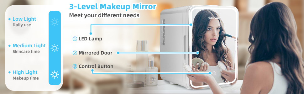 Lighted Mirror Door Design: Our mini fridge is designed with a mirrored door made of tempered glass, which brings maximum convenience to your morning routine. Also, you can long press the touch control button to turn on/off the LED light and short press to adjust brightness in 3 levels.