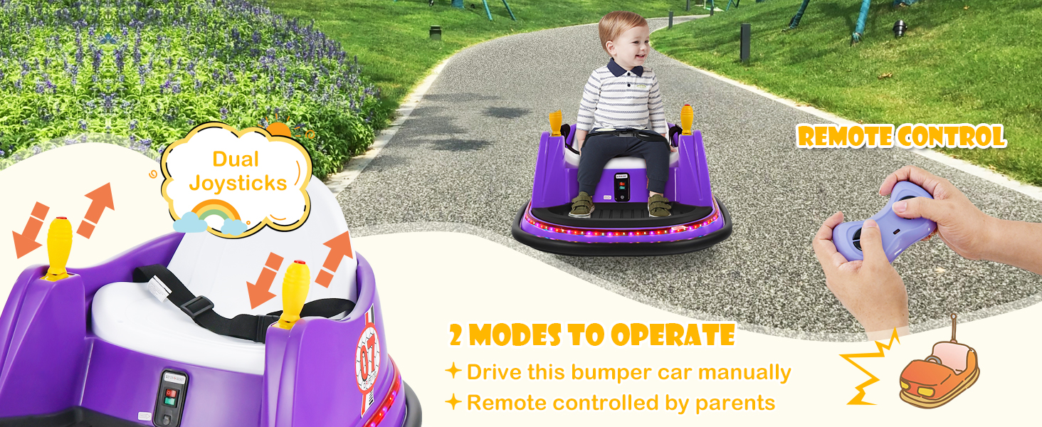 2 Different Ways to Control: This bumper car is designed with two driving modes: kid's manual operation and parental remote control. Kids can manually operate the car to move forward or backward with dual joysticks. Besides, parents are allowed to control the car if necessary.